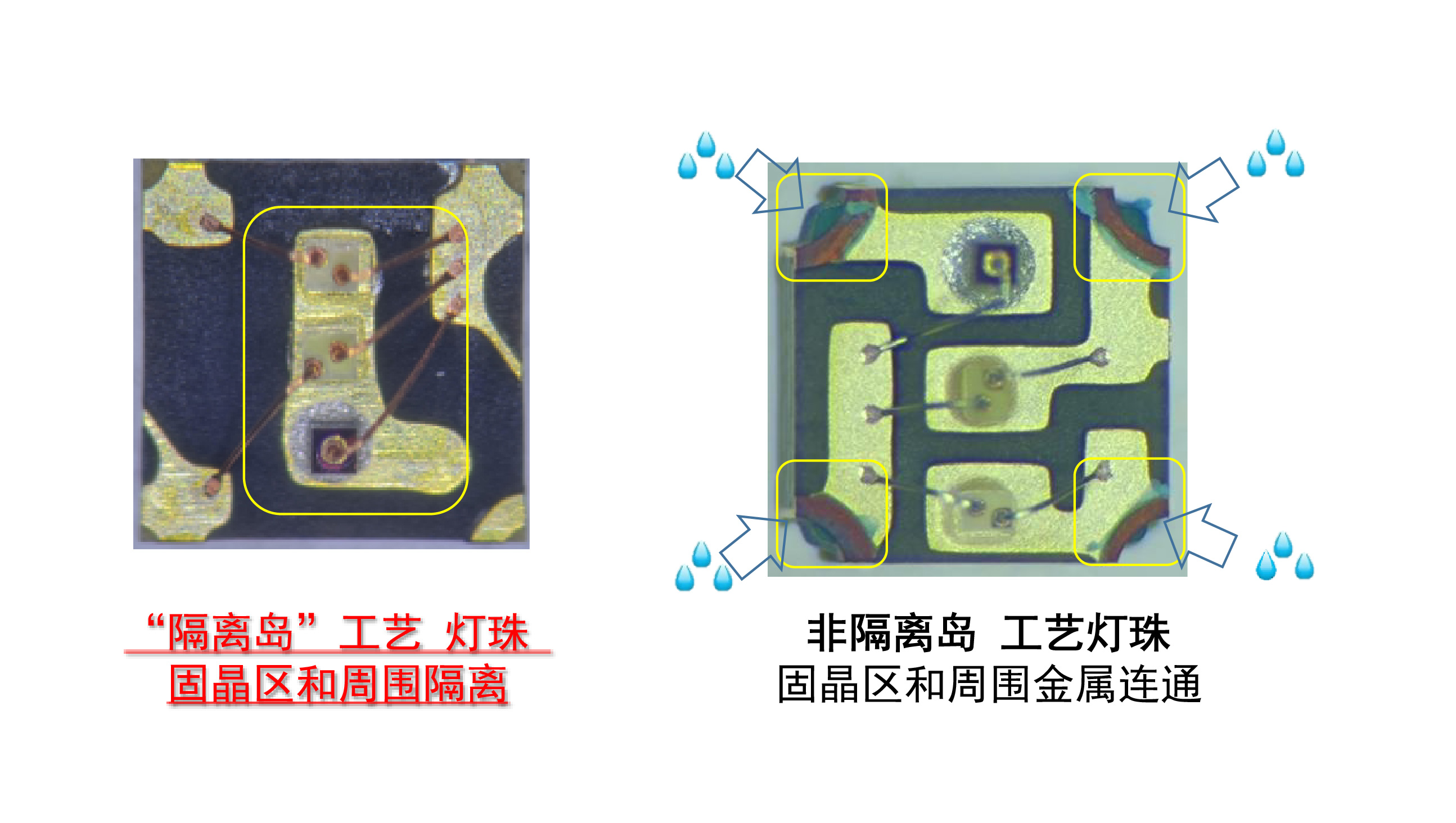 采用“隔離島”技術(shù)的封裝工藝,讓中間固晶區(qū)和周圍管腳焊盤無直接連通,避免外部水汽進(jìn)入燈珠內(nèi)部,提升密封性與穩(wěn)定性,有效預(yù)防死燈和毛毛蟲故障現(xiàn)象。